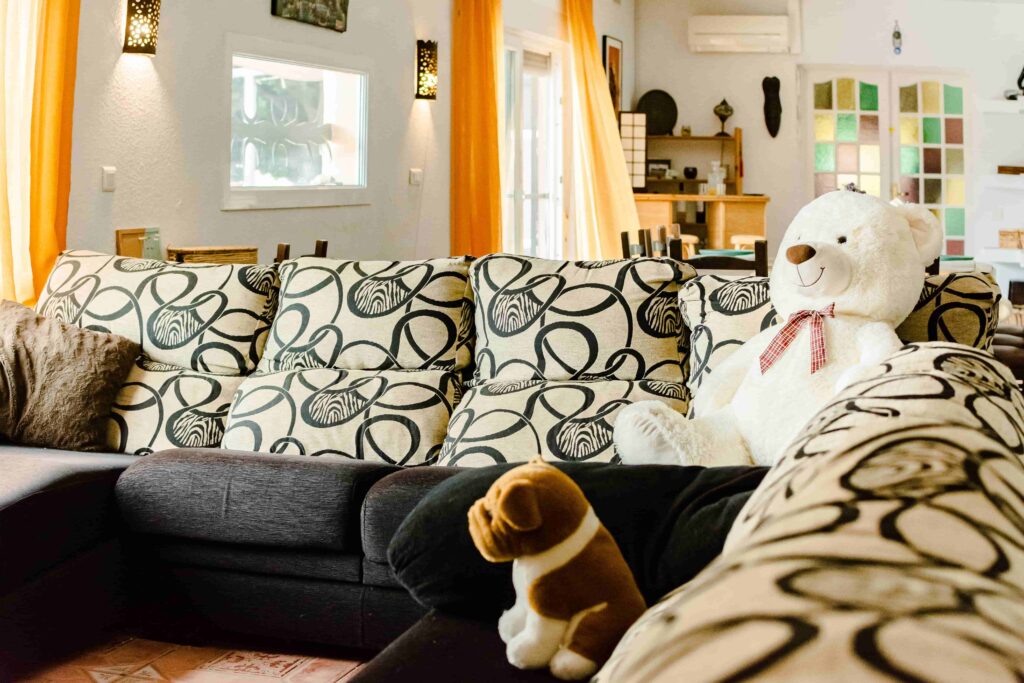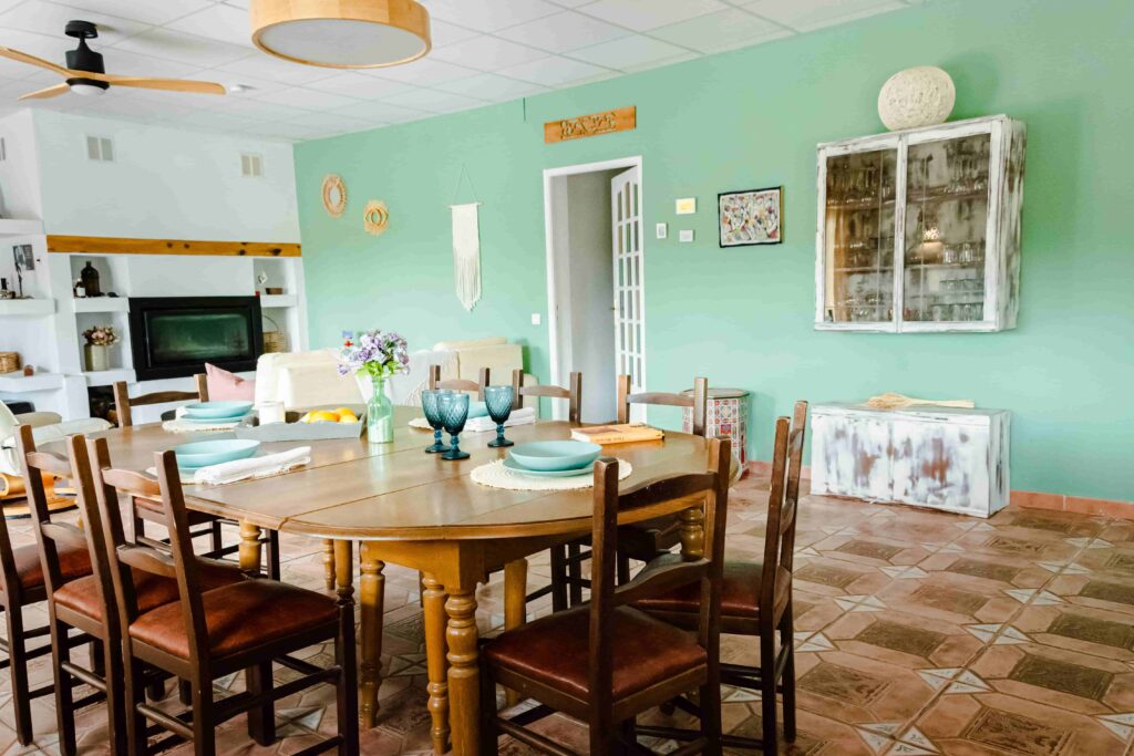 Nuestro salón comedor no solo invita a disfrutar de comidas familiares en la gran mesa, sino que también ofrece una zona de relax con cómodos sofás. Además, la zona de juegos infantiles integrada permite que los más pequeños se diviertan y se entretengan en un ambiente seguro y cercano. Esta combinación de comodidades convierte este espacio en el corazón de la convivencia familiar durante tu estancia en nuestra casa rural en Tarragona.